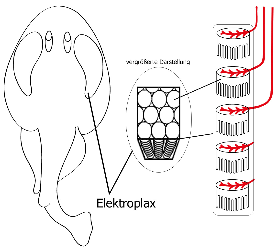Die Organe bestehen aus Muskelfasern, die nicht mehr kontrahieren können, den sog. elektrische Platten. Diese Platten sind auf der einen Seite papilös, auf der anderen Seite glatt. Auf der glatten Seite befinden sich Synapsen, mit denen die Organe mit anderen Organen, Muskeln, Drüsen usw. verbunden sind. Mehrere tausend dieser Platten sind in Säulen seriell geordnet. Durch diese Ordnung entstehen sehr hohe Spannungswerte, wobei die Stromstärke von der Anzahl der parallel geordneten Säulen bestimmt wird.