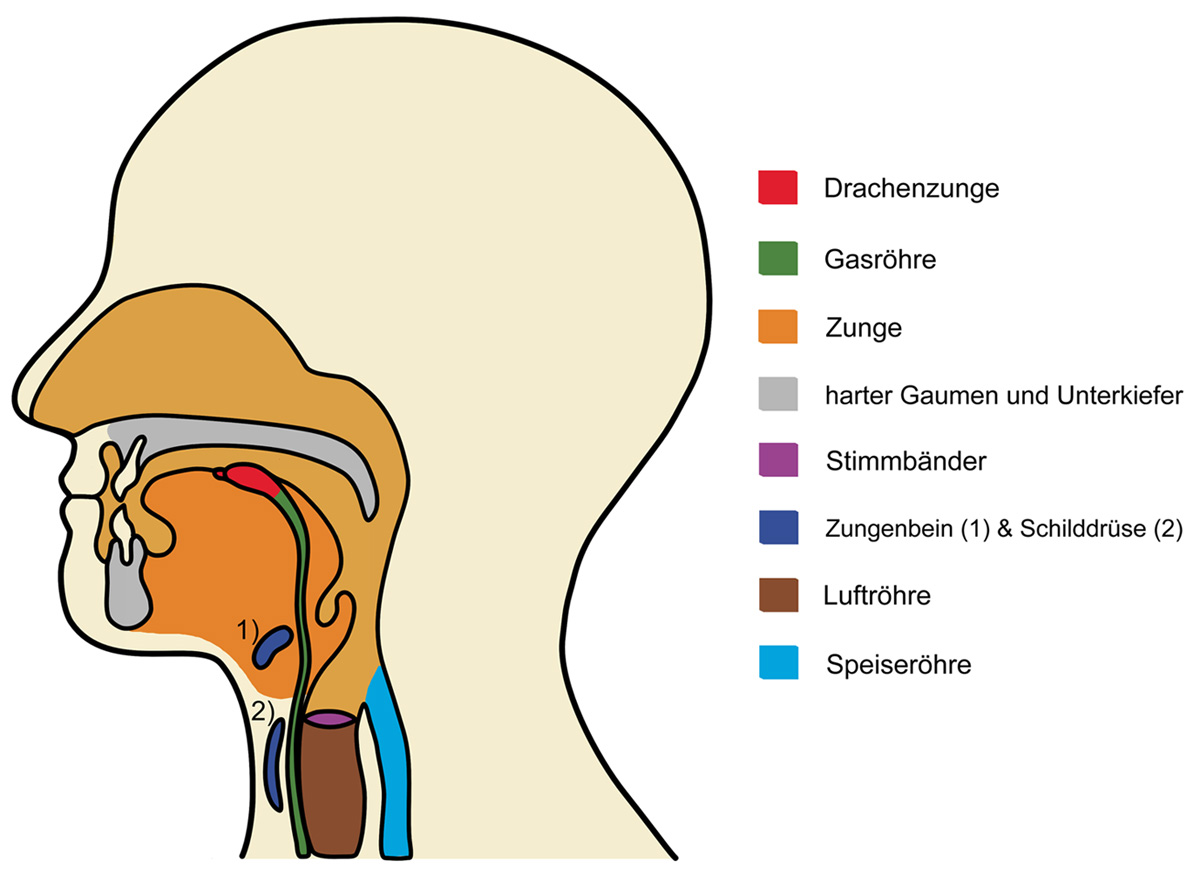 Betrachtet man die Drachenzunge im ausgelagerten Zustand, hat sie Ähnlichkeit mit der Glottis von Schlangen (= Beginn der Luftröhre im Unterkiefer der Schlange und direkter Weg zur Luftreserve im Lungenflügel).