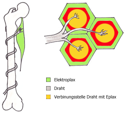 Die Drähte um die Knochen sind nur an ihren Enden fest mit dem Skelett verbunden. Über die ganze Länge der Gebeine sind sie beweglich und können dadurch eine dichtere oder lockere Wicklung annehmen. Durch das sich im Knochengewebe befindliche Metall können die Drähte verlängert und dadurch eine dickere Wicklung erreicht werden. Hierfür wird das flüssige Metall im Knochengewebe durch extra Kanäle an die Außenfläche gesaugt oder wieder ins Innere gezogen. Die Drähte sind zudem mit den sie umgebenden Elektroplax verbunden.